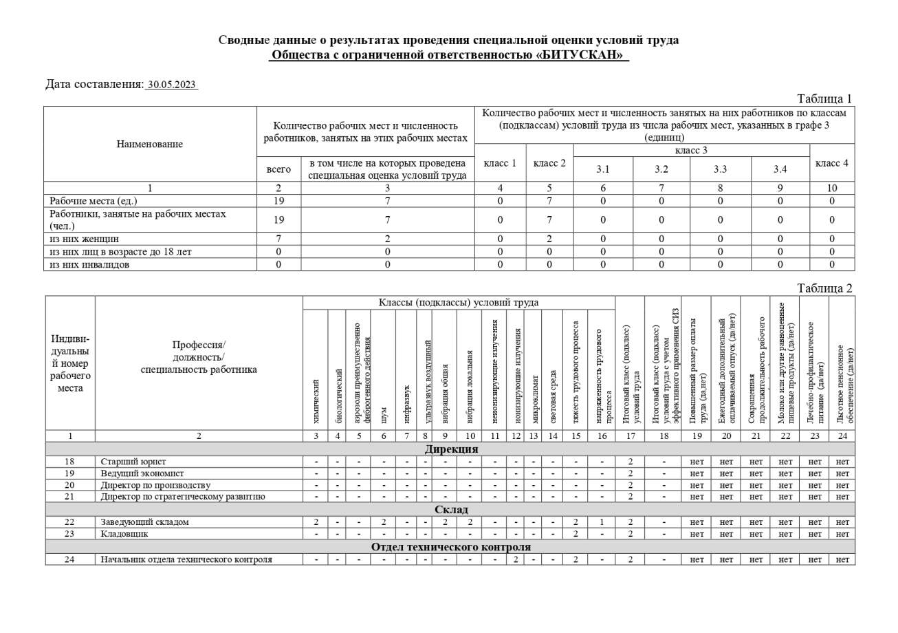 В соответствии с требованиями части 6 статьи 15 Федерального закона от 28.12.2013 №426-ФЗ «О специальной оценке условий труда» сводные данные о результатах проведения специальной оценки условий труда в части установления классов (подклассов) условий труда на рабочих местах и перечня мероприятий по улучшению условий и охраны труда работников, на рабочих местах которых проводилась специальная оценка условий труда, размещены на сайте Общества: