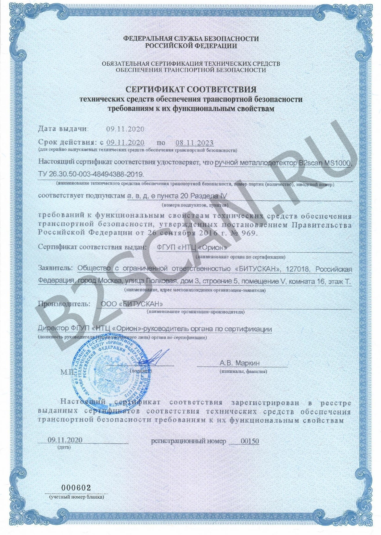 ООО «БИТУСКАН» получило Сертификат соответствия Федеральной Службы Безопасности на ручные металлодетекторы B2scan MS1000 и B2scan MS2000 согласно требованиям Постановления №969 Правительства РФ
