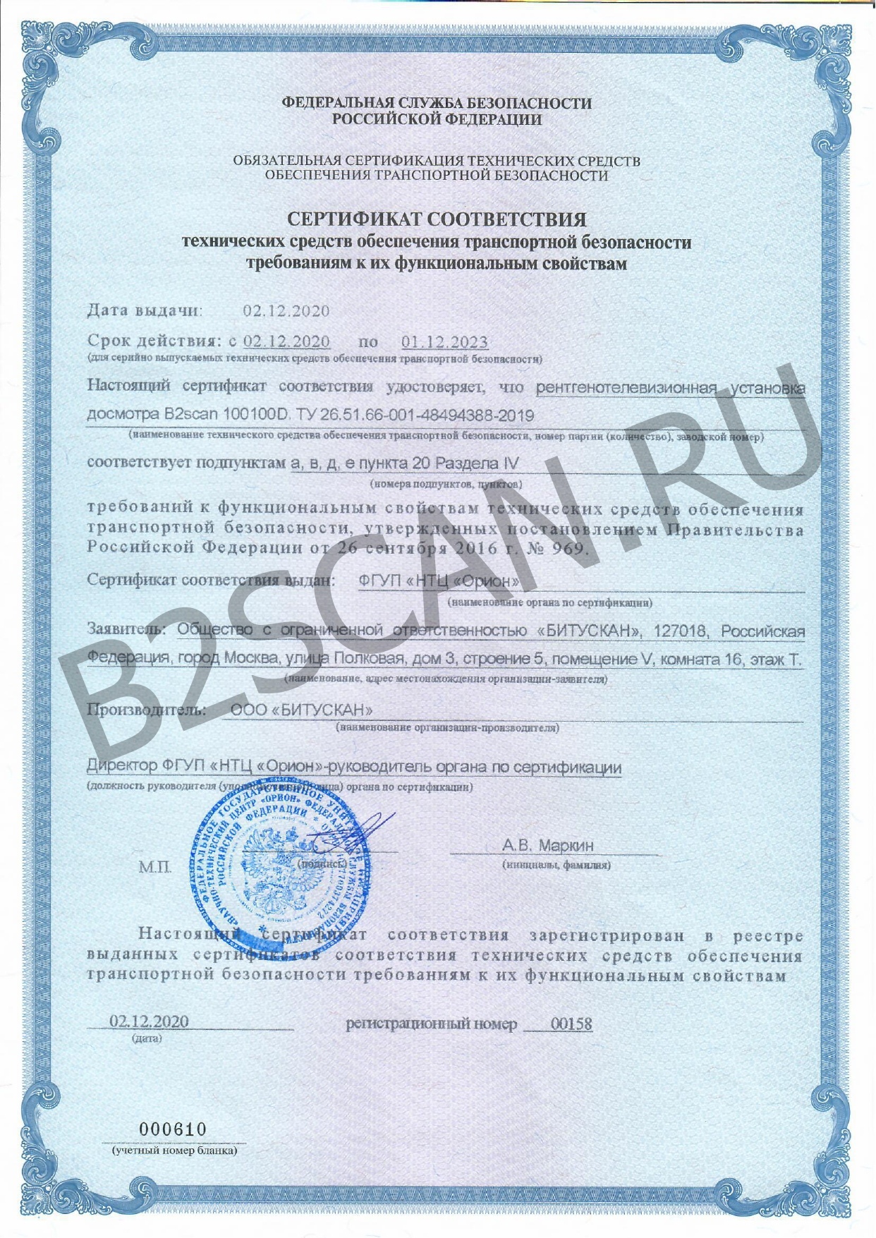 ООО «БИТУСКАН» получило Сертификат соответствия Федеральной Службы Безопасности на рентгенотелевизионные установки досмотра B2scan 100100D согласно требованиям Постановления №969 Правительства РФ